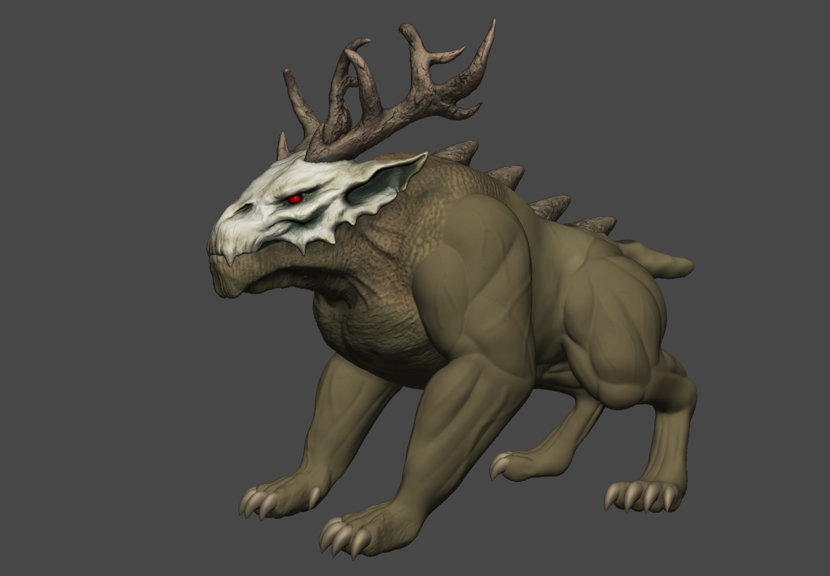 Taking the dice roll into account, I decided to go for a malevolent forest demon. An ancient, stag and hound-like beast with twisted horns, moss-covered muscle, and ember-red eyes. Born from the dark heart of the woods, it's a predator shaped by both nature and nightmare. The design focuses on natural textures, a muscular build, and a haunting, intelligent presence.